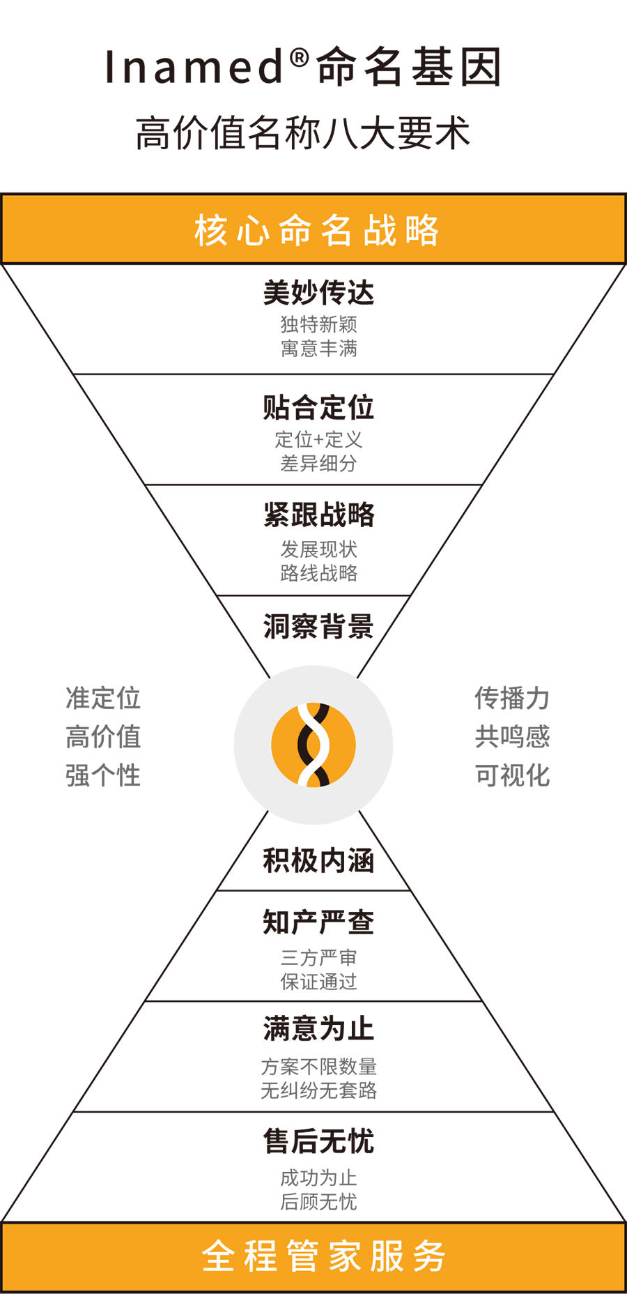 根據(jù)目標(biāo)群體需求特征以及品牌起名定位,通過字義、字音、字性等多種方法,創(chuàng)意命名方案;對名稱進(jìn)行商標(biāo)注冊系統(tǒng)篩查等。